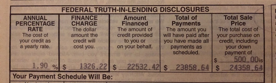 한번에 돈을 다 주고 샀는데도 불구하고 out-door-price를 $21,500 줬다는 말을 듣고, 한번에 full-payment를 다 주고 사는 가격과 할부가격과는 별반 차이 나지않는것 같았아요~