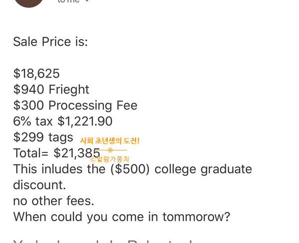 그냥 best price 잘 달라고 하면, 차값만 싸게 제시하고, 나중에 다른 부과비(세금, 서류비, 악세사리비, 운송비 등등..)로 왕창 붙힐수도 있거든요..!
