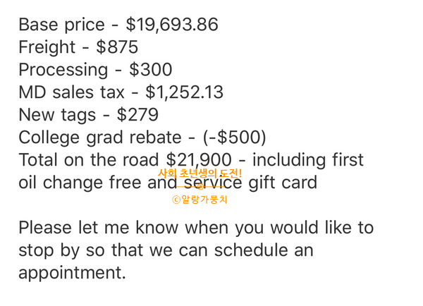 원래 딜러가 제시한 out door price(자동차의 모든 수수료 포함)가 $21,385 였고,