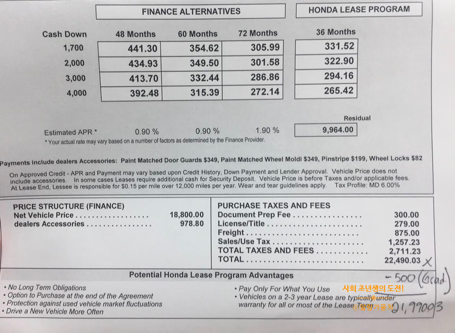 그당시 혼다에서 이벤트 하던 “0.9% Interest rate for 60 months” 또는 “1.9% Interest rate for 72months” 으로 할부받을수 있었어욧!